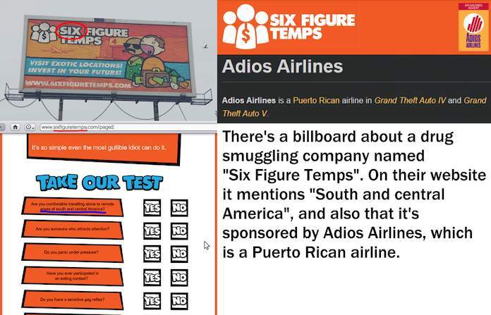 Najnovija špekulacija vezana za upravo taj setting dolazi sa Reddita, gdje je jedan od igrača ”petice” naišao na zanimljivi oglas. Reklama u igri za fiktivnu agenciju koja preprodaje drogu ”Six Fire Temps”, spominje centralnu i južnu Ameriku. U reklami, koju možete vidjeti ispod, spominje se sponzorstvo Adios Airlinesa iz Portorika, što je mnogima bilo dovoljno da povežu sa prijašnjim informacijama o tome da se igra događa u osamdesetima te da će priča biti centrirana na preprodaju kokaina. Rockstar je poznat po ovakvim sitnicama koje najavljuju nove projekte, no ništa nije potvrđeno. Ovo je samo još jedan trag koji potvrđuje neke prijašnje glasine, no još nema nikakve službene vijesti vezane za navodni šesti nastavak popularnoga serijala.