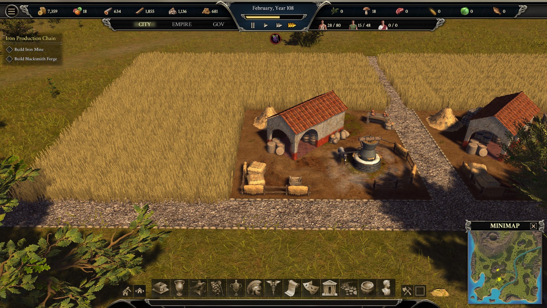 Tehnologija je dobila svoje proširenje; sada možemo uzgajati pšenicu, izgraditi rudnik za željezo i koristiti cigle. Istovremeno, Pompeii: The Legacy je balansiraniji. Dobio sam osjećaj da su neke zgrade jeftinije i lakše se izgrađuju. Međutim, ono što sam primijetio jest da je transport u igri prilično spor ili previše građevina ovisi jedna o drugoj, bez obzira što možemo nadograditi ceste i ubrzati protok kroz tehnologiju. Zgrade će biti razbacane po cijeloj mapi: nešto mora biti bliže vodi, kamenolom se mora graditi na planini, a nije točno jasno koliko hrane skupljate kroz lov i sakupljanje gljiva. Iako treba vremena da se nešto dočeka, proces proizvodnje je brži i to se vrlo dobro osjeti u odnosu na playtest.