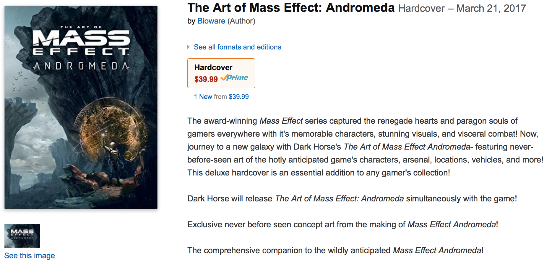 EA i BioWare su kao okvirni datum izlaska igre naveli početak iduće godine, no informacije koje su se pojavile na Amazonovoj produktnoj stranici Dark Horseovog art booka The Art of Mass Effect: Andromeda dale su nam naslutjeti da bismo igru u prodaji mogli vidjeti krajem ožujka.