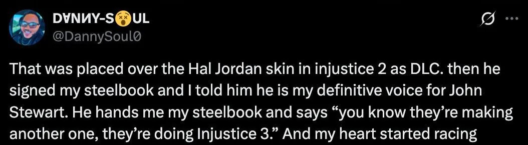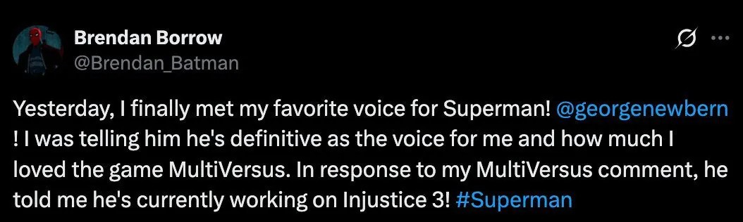 Na nedavnom Nostalgia Conu u Houstonu, jedan od DC obožavatelja je podijelio iskustvo susreta s Philom LaMaarom, koji daje glas Green Lanternu, koji mu je prilikom potpisivanja Injustice steelbook izdanja otkrio da je treća Injustice igra u razvoju. Slična potvrda stigla je i od Georgea Newberna, koji posuđuje glas Supermanu, koji je na društvenoj mreži X (bivši Twitter) otkrio da upravo snima nove dijaloge za Injustice 3.