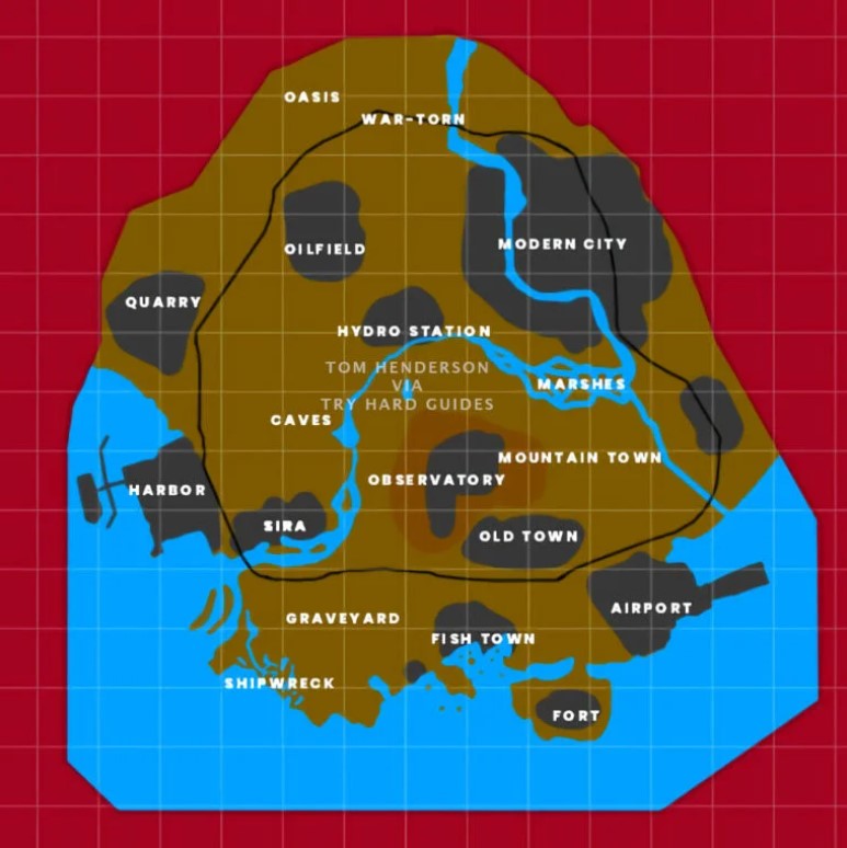 Kao što možete vidjeti ispod, nova mapa se sastoji od nekoliko različitih segmenata – kopna, planina, oceana i rijeka. Lokacije koje su navedene na mapi su sljedeće: Oasis, War-torn, Quarry, Oilfield, Modern City, Hydro Station, Marshes, Harbor, Caves, Observatory, Mountain Town, Sira, Old Town, Graveyard, Fish to Win, Airport, Shipwreck i Fort.