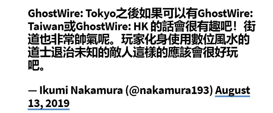 Naime, Nakamura je putem Twittera nedavno objavila post u kojem je nagovjestila moguće lokacije za potencijalne nastavke svoje nove igre. Tom prilikom spomenula je Taiwan i Hong Kong, iz čega bismo mogli zaključiti da će GhostWire: Tokyo svoju inspiraciju dobrim dijelom crpiti iz azijske kulture. Problematični tweet vrlo brzo je uklonjen, no ne i dovoljno brzo da ostane neprimjećen.