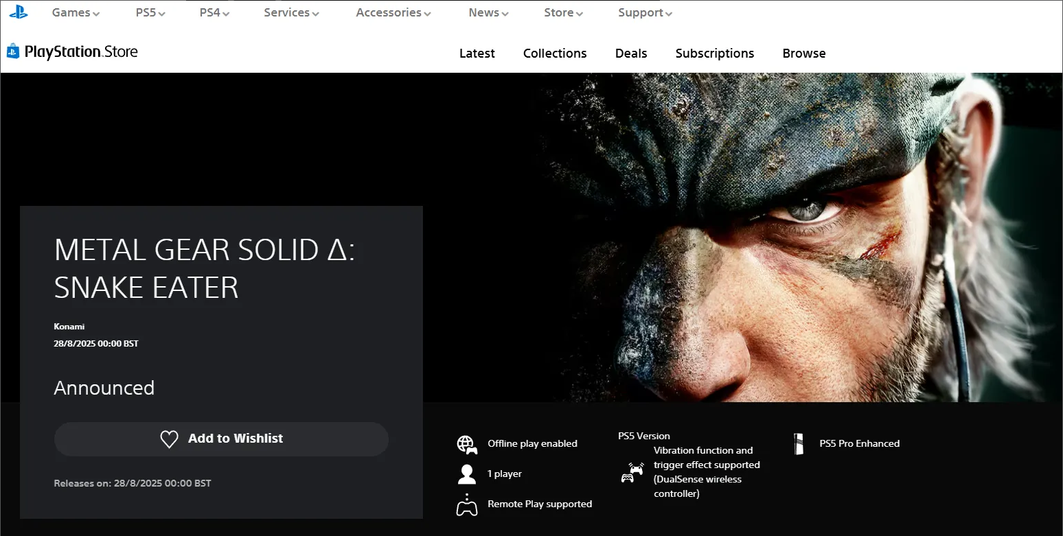 Iscurjeli trailer, koji možete vidjeti na ovom linku, otkrio je i datum izlaska remakea spomenutog Konamijevog hita, a iste informacije su, kao što možete vidjeti ispod, osvanule i na PlayStation Storeu. Prema tim informacijama, Metal Gear Solid Delta: Snake Eater izlazi 28. kolovoza.