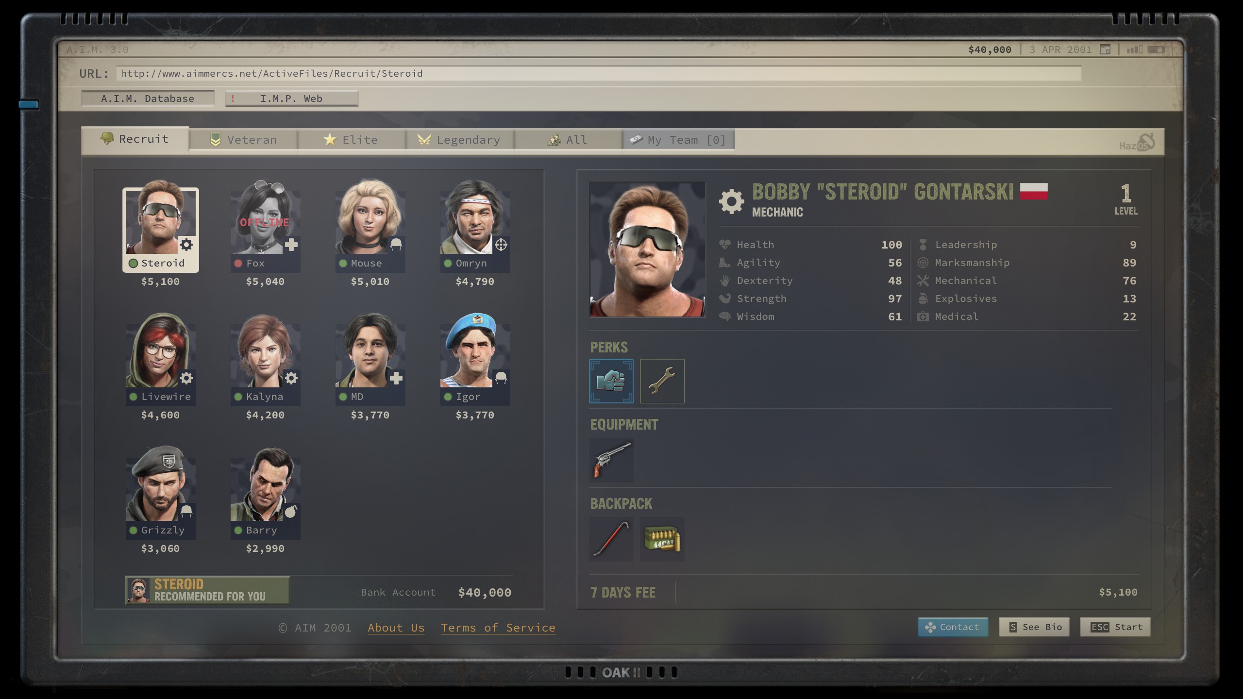 Morat ćete odabrati svoj tim plaćenika, odnosno vodite neku svoju organizaciju koja ih zapošljava. U početku ste limitirani s financijama, a kako budete prolazili kroz različite misije i dobivali novce, vrlo lako će biti moguće zaposliti i one najiskusnije borce. Dapače, svaki od njih ima svoju specijalnost, odnosno netko je bolji u liječenju, u pucanju, šuljanju, hakiranju, itd. Ono što nisam očekivao je da plaćenici imaju svoje osobnosti, što može utjecati na tijek igranja i na odnose unutar tima. Također, možete odabrati i na kojoj težini ćete igrati, First Blood nudi standardno igranje, dok Mission Impossible igrate ako želite patiti, točno tako je i sama igra opisala ovu težinu. Osim toga, možete promijeniti i pravila igre, bilo da želite mogućnost da možete pauzirati igru ili da smrt zapravo označava smrt bez da prvo imate priliku oživjeti pale suborce.