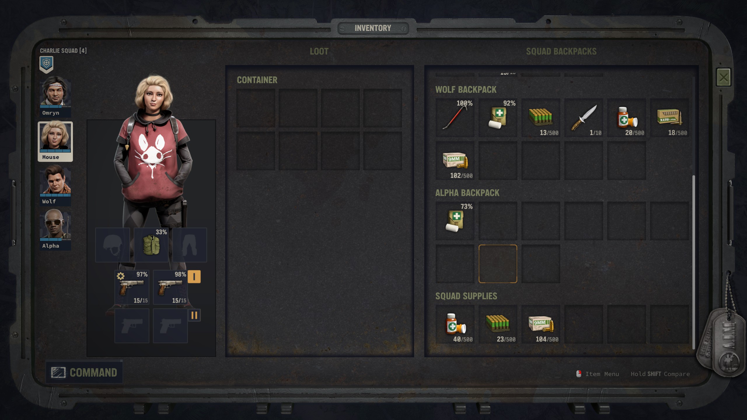 Ruksak, odnosno inventar, igra glavnu ulogu u ovoj igri i funkcionira na principu onoga iz Resident Evila, gdje ste limitirani i količinom i položajem. Međutim, postoji i globalni ruksak koji dijele svi, a možete i prebaciti predmete s jednog plaćenika na drugog ako su dovoljno blizu jedan drugom. Nakon svake misije bit će važno da istražite do kraja područje i pokupite stvari koje su ostavili poraženi neprijatelji. Te predmete ili oružja možete kasnije iskoristiti, bilo da se želite liječiti, popraviti oružja, nadograditi ih (postoji zbiljan detaljan sustav nadograđivanja oružja) ili jednostavno prodati.