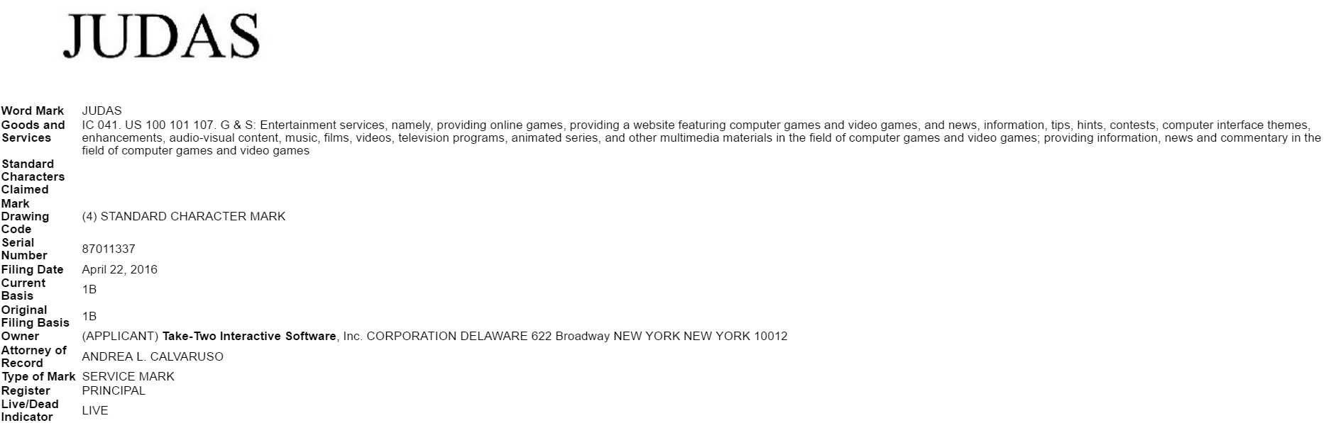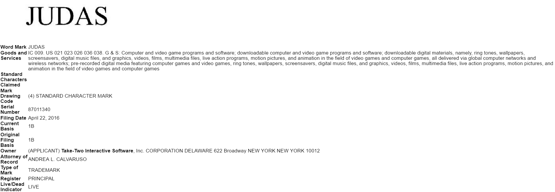 Naime, Rockstar i 2K Games su kod United States Patent & Trademark Officea podnijeli zahtjev za registraciju trademarka “Judas”, a opis koji možete vidjeti ispod, odnosi se na video igre i online software.