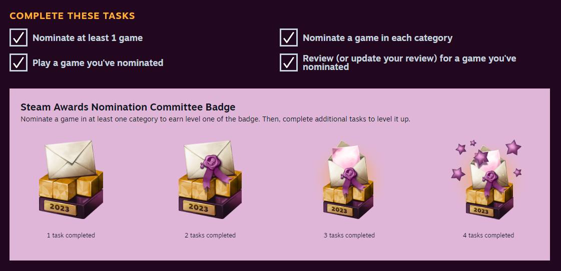 Steam Autumn Sale 2023 započeo je 21. studenog, a korisnici su imali priliku nominirati svoje omiljene igre u raznim kategorijama poput Igre godine, Labor of Love, Better with Friends, itd. Pored toga, igrači su imali priliku osvojiti Steam Awards Nomination Committee Badge ispunjavajući četiri zadatka, uključujući i recenziju igre koju su nominirali.