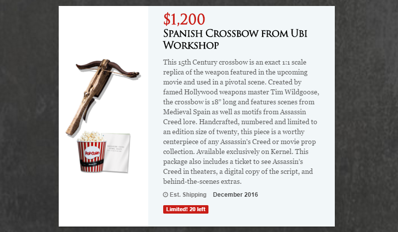 Također, tu su i druge, nešto povoljnije ponude – ukoliko kupite ekskluzivnu ulaznicu po cijeni od $600, dobit ćete na poklon službenu licenciranu statuu Aguilara, glavnog lika iz filma, assassina kojeg je u filmu utjelotvorio Michael Fassbender. Uz ulaznicu od $120 na poklon ćete dobiti službenu duksericu, za $60 Aguilarovu skrivenu oštricu, $25 majicu, dok će uz ulaznicu od $15 kao bonus dolaziti kolekcionarski sat i privremene tetovaže.