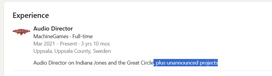 Iako je tek priveo kraju razvoj igre Indiana Jones and the Great Circle, odnosno još uvijek radi na njenoj podršci i nadolazećem PS5 portu, MachineGames ima pune ruke posla, radeći i na nekoliko drugih, još uvijek nenajavljenih projekata. Barem tako sugeriraju informacije koje su se našle na LinkedIn profilu Petea Warda, jednog od uposlenika spomenutog studija.