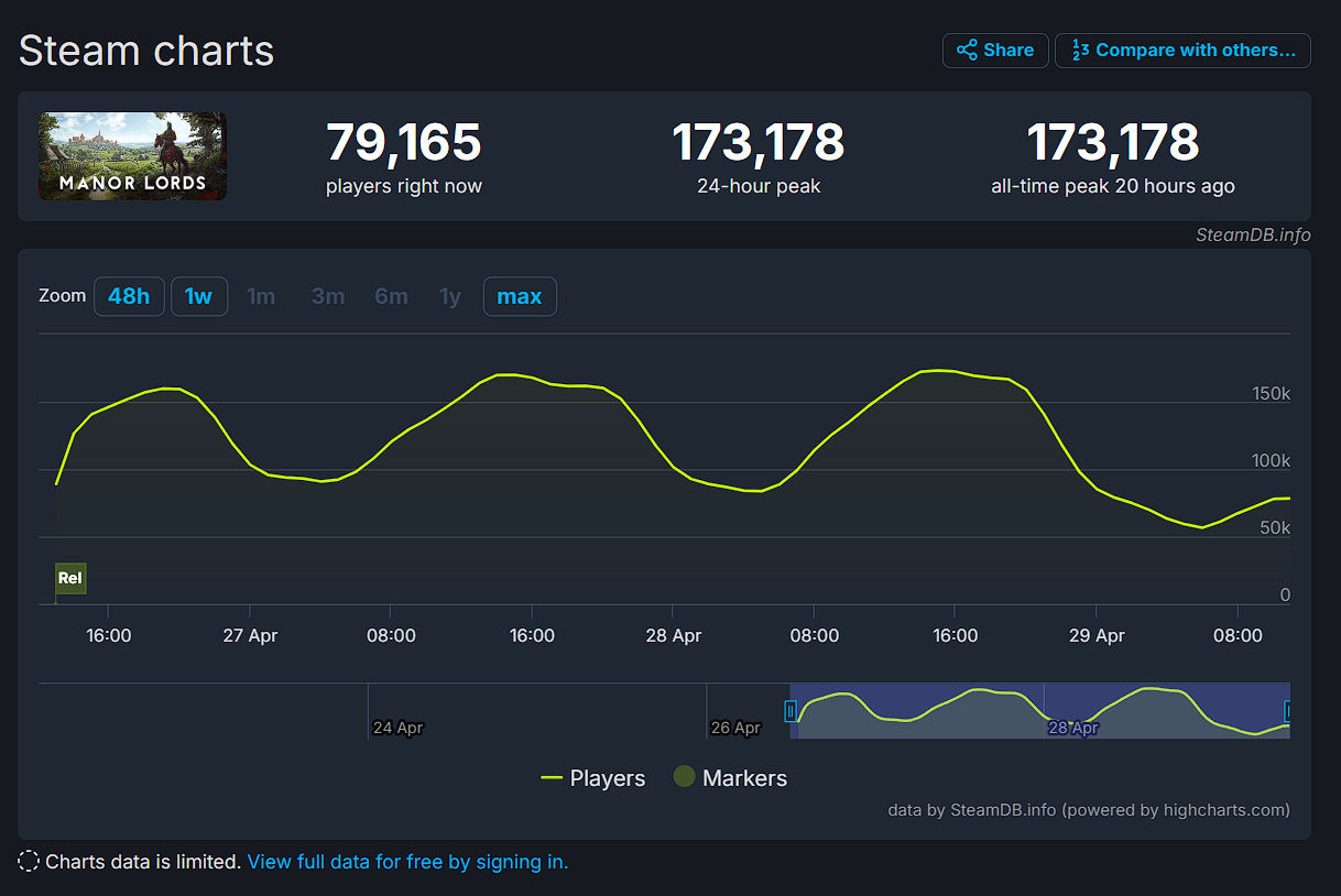Najželjenija nadolazeća igra na Steamu, Manor Lords, objavljena je u Early Accessu prošli tjedan, točnije 26. travnja. Već je privukla veliki broj igrača u samo prvih nekoliko sati, pa pogledajmo bliže neke brojke.