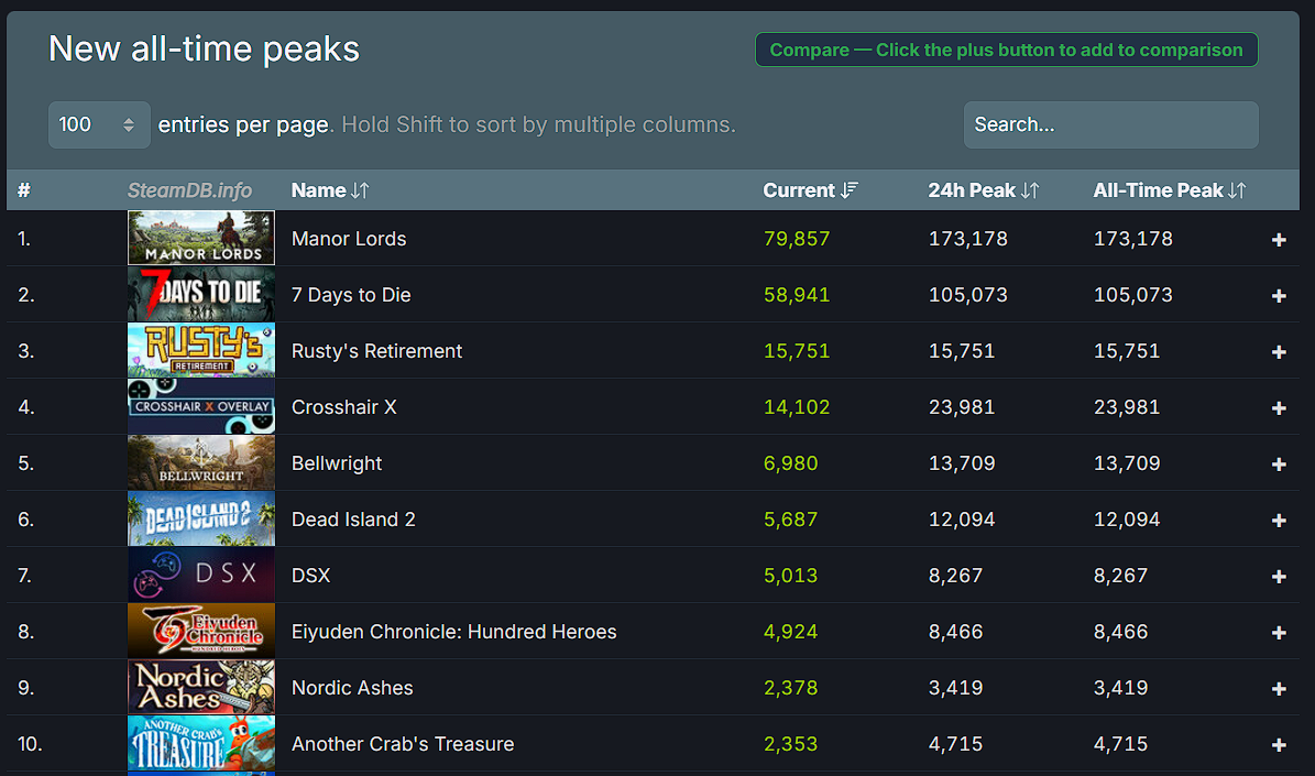 Kad su u pitanju nove igre koje su nedavno izašle, Manor Lords se nalazi na vrhu, dok je osmi među najigranijim igrama na Steamu općenito u posljednjih 24 sata, gdje je CS2 još uvijek na prvom mjestu.