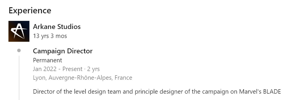 I dok su svi očekivali da će Arkane Lyon tijekom nedavno održanog The Game Awardsa najaviti novi Dishonored ili Deathloop, ovaj francuski studio je iznenadio sve najavivši Marvel’s Blade. Tom prilikom, otkriveno je da je spomenuta akcijska avantura iz trećeg lica u ranom razvojnom stadiju. No, ipak, ako je vjerovati informacijama koje su primjećene na LinkedIn profilu jedne od uposlenica ovog studija, Marvel’s Blade bi mogao biti u razvoju znatno duže nego što to mislimo.