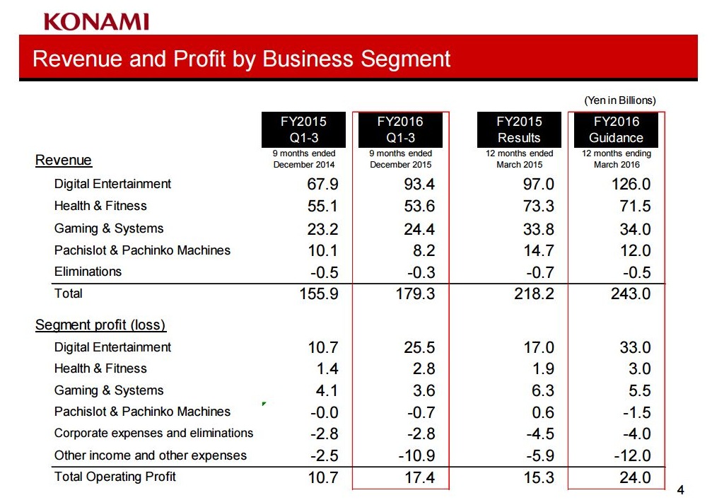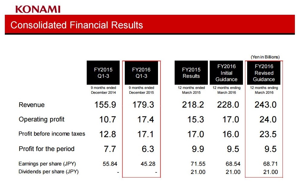 Konami je danas objavio svoje financijske rezultate koji se odnose na kraj prošle godine i idu unatrag devet mjeseci. Sve u svemu, izvještaj prikazuje dosta pozitivne rezultate. Na slici ispod možete vidjeti porast profita s obzirom na 2014.godinu i isto razdoblje: