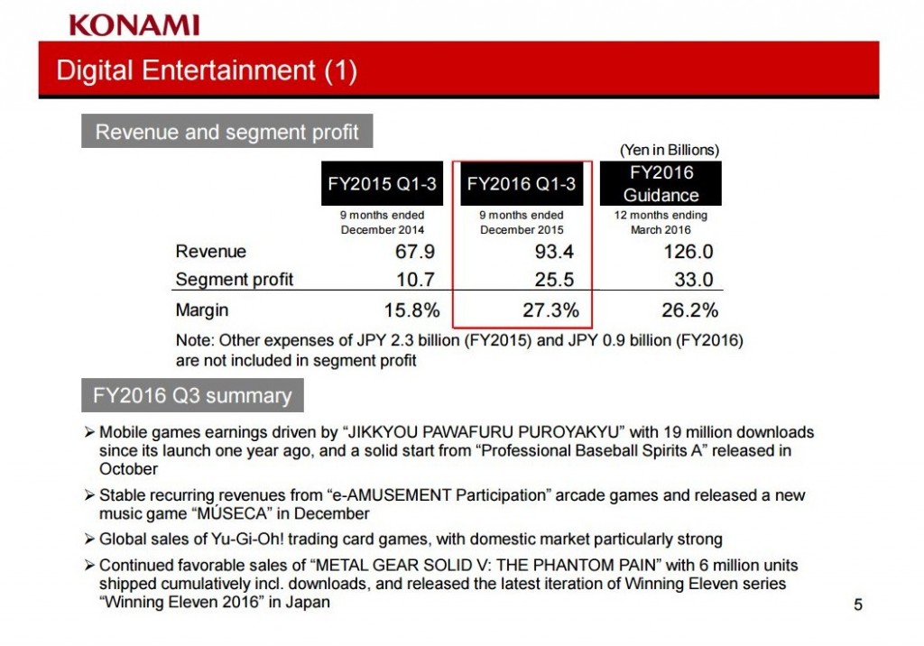 Ostatak izvještaja i predikcija jasno daje do znanja da je digitalni dio tvrtke, koji uključuje i igre naravno, dio koji donosi tvrtki najviše zarađuje i donosi najveći profit. Najinteresantnije je što se Kojimina igra MGS V, navodi kao igra koja im donosi najviše zarade. Dosad je prodano 6 milijuna primjeraka igre (uključujući fizičke i digitalne primjerke).