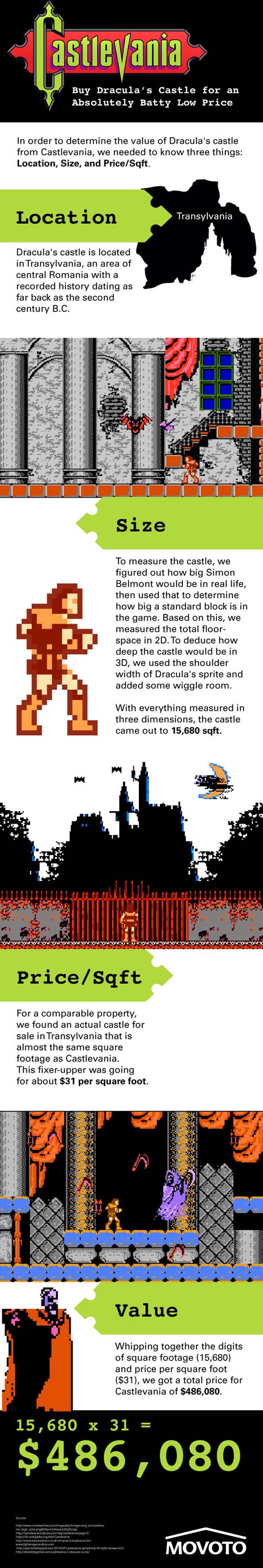 Movoto, poznati blog koji se bavi nekretninama, procjenom i ponudom istih, u zadnje vrijeme je, čini se, pronašao novu vrstu zanimacije. Naime, nedavno su na svojim stranicama objavili procjenu vrijednosti za dvorac princeze Peach iz vjerojatno najpopularnije igre svih vremena, Super Maria. Dvorac je procijenjen na čak 1 milijardu američkih zelembača, a vijest su prenijeli gotovo svi mediji koji imaju veze sa gamingom. Vjerojatno su i sami bili i više nego iznenađeni velikim skokom u čitanosti i broju klikova što je očito glavni razlog i poticaj Movotu da ponovno naprave novu “gaming procjenu”. Ovoga puta su se odlučili za drakulin dvorac iz porta originalne Castlevanie za NES (Nintendo Entertainment System). Kako sami kažu, temelj procjene bazira se na konverziji visine glavnog protagonista Simona Belmonta sa širinom njegovih ramena, preko kojih su odredili 3D prostor, a samim time uspjeli odrediti da je veličina Drakulinog dvorca 15.680 kvadratnih stopa, odnosno otprilike 1457 m2 u našoj mjernoj jedinici, što po trenutnoj vrijednosti sličnih dvoraca u stvarnom svijetu u Transilvaniji od oko 333 dolara po kvadratu, daje cijenu od ukupno 486.080 američkih dolara. Ako vas je ovo informacija upravo otpuhala sa stolice i željeli bi ste znati više informacija i pojedinosti, možete ih pronaći na Movotovoj stranici.