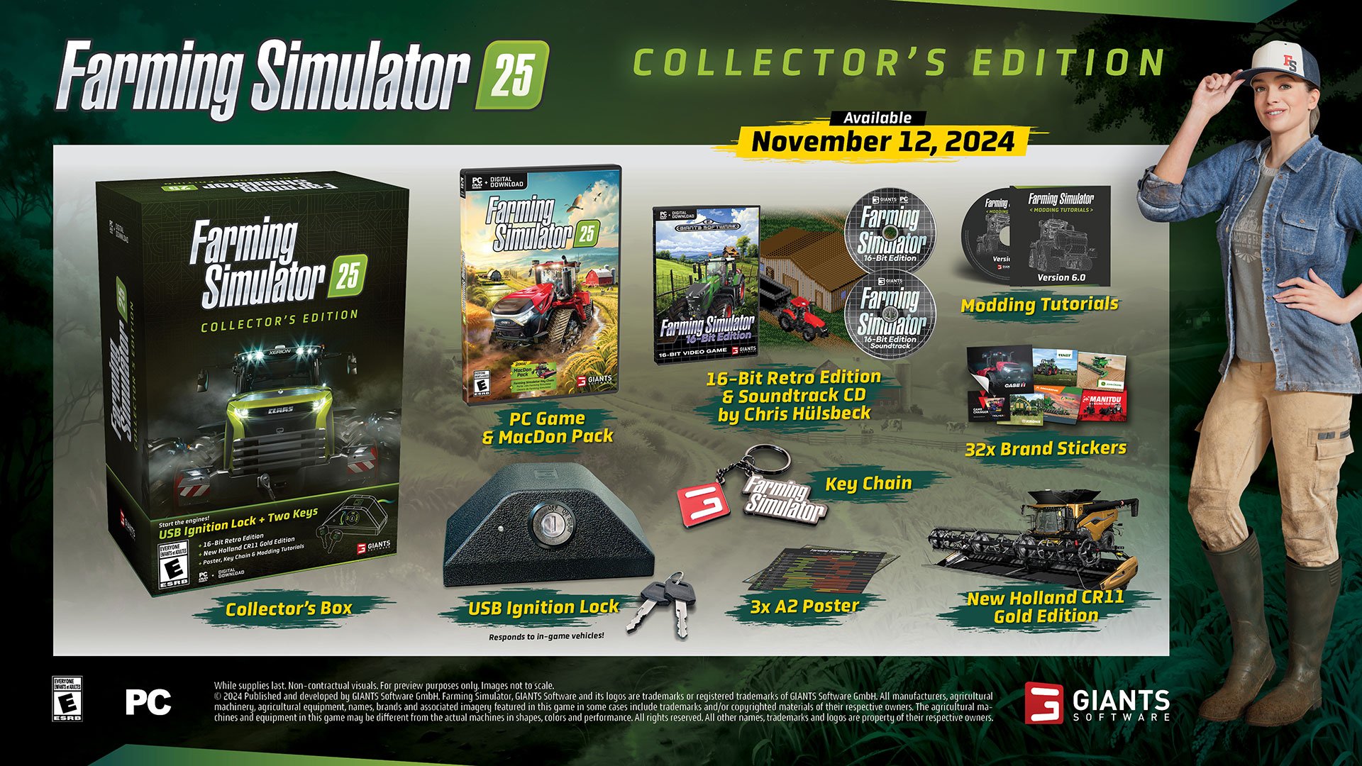 Ljubitelji poljoprivrede će htjeti provjeriti i Farming Simulator 25 Collectors’ Edition, ekskluzivno izdanje za PC uključuje USB ključ za pokretanje traktora u igri, verziju inspiriranu Mega Driveom s 16-bitnim zvukom, te CD s originalnim soundtrackom koji sadrži 15 pjesama Chrisa Hülsbecka za ljubitelje retro glazbe i još mnogo toga.