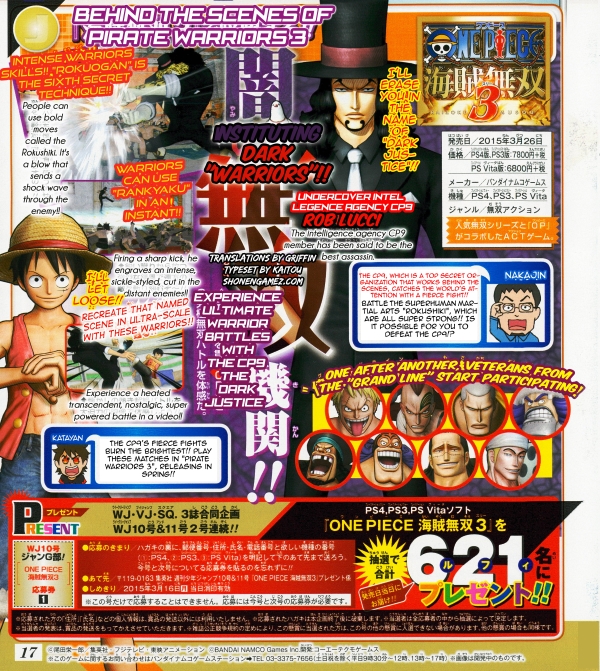 U zadnjem broju tjednog japanskog gaming magazina Shonen Jump predstavljeni su još neki detalji oko nadolazeće One Piece igre. Rob Lucci je potvrđen kao jedan od likova za One Piece Pirate Warriors 3. Uz njega su potvrđeni još i Bellamy, Wapol, Enel i Blackbeard a očekuje nas otkrivanje još nekoliko novih likova u bliskoj budućnosti. Rob Lucci će imati i svoju posebnu Zoan transformaciju, a moći ćete sudjelovati u legendarnoj borbi njega i Luffya koja se dogodila tijekom Enies Lobby priče.