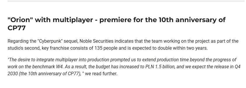 Prema riječima analitičara Mateusza Chrzanowskog, koji je ranije točno predvidio izlazak DLC-a za The Witcher 3: Wild Hunt, na Project Orionu trenutno radi 132 developera, no taj će se broj u narednim godinama udvostručiti. Razlog je jasan – CD Projekt RED želi izbjeći ponavljanje grešaka iz prošlosti i osigurati da multiplayer komponenta bude besprijekorno integrirana.