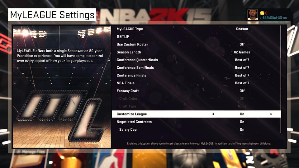 MyLeague mod igračima daje šansu da sami kontroliraju cijelu NBA ligu, ali i ostale timove, uključujući i Euroligu. U ovom modu moguće je u cjelosti utjecati na dužinu trajanja sezone, roster, draft, povrede igrača, te na taj način skrojiti unikatno iskustvo.