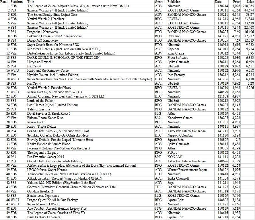 Media Create su upravo objavili potpunu listu najprodavanijih igraćih naslova za tjedan od 9.veljače do 15.veljače. Top lista se sastoji od popisa 50 najprodavanijih igara u tom tjednu na kojoj se nalaze razne zanimljive informacije o stanju na japanskom tržištu. Zelda je, naravno, najprodavanija dok je Samurai Warriors 4-II za PlayStation 3 druga najprodavanija igra tog tjedna. Ista igra se dosta dobro drži i u svojim Vita i PlayStation 4 verzijama, dok na listi nema nijednog Xbox naslova. Potpunu listu možete vidjeti na priloženoj slici: