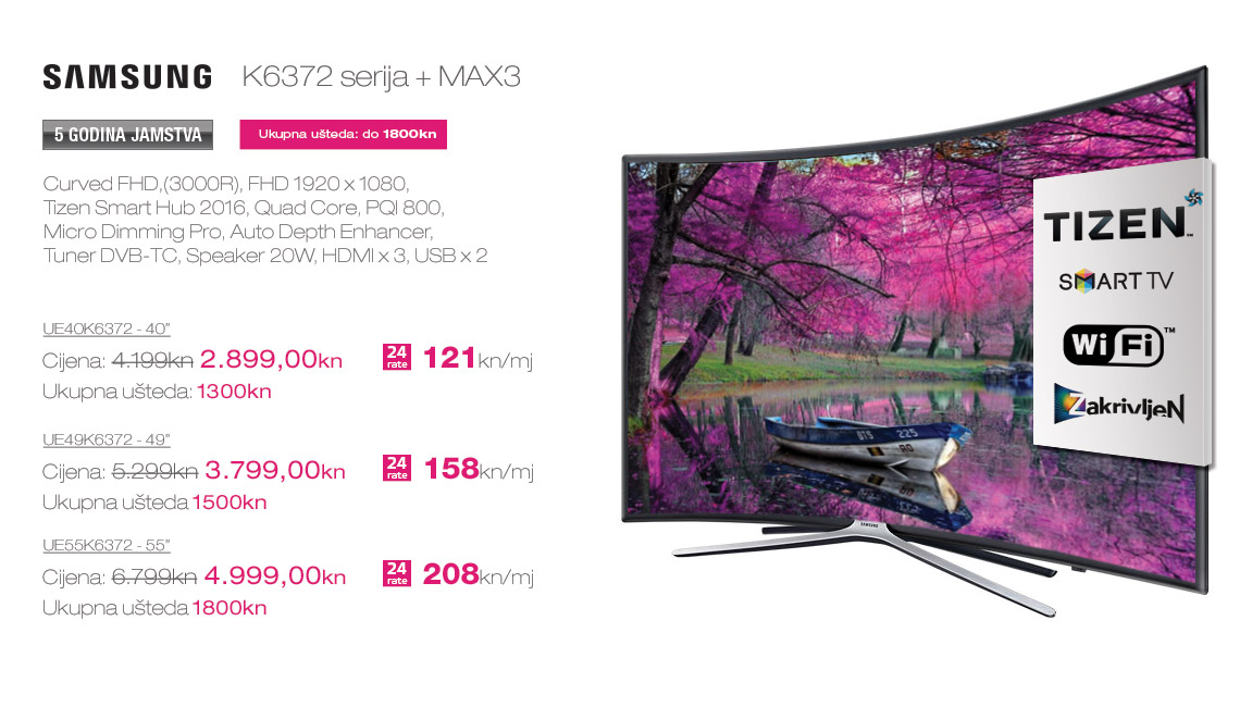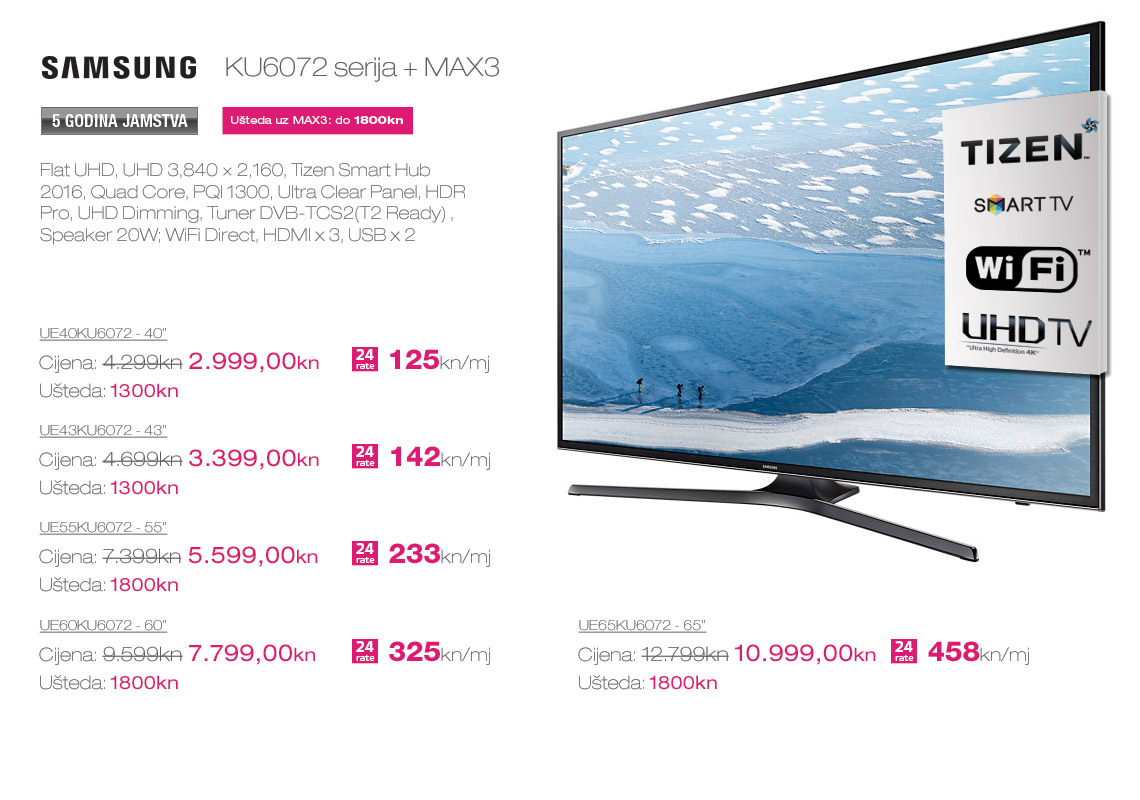 MaxTV je probio led kao prva IPTV usluga u Hrvatskoj, a danas je zasigurno najnaprednija IPTV platforma u zemlji koja nudi najviše mogućnosti i sadržaja. Pogodnosti pri kupovini najnovijih Samsung televizora zajedno sa MAX3 paketima su značajne. Kupci će dobiti od 1000kn do 1800kn nižu cijenu pri kupnji vrhunskog Samsung televizora uz dodatne pogodnosti; 5 godina jamstva, 24 rate bez kamata, besplatnu dostavu te vrhunski TV sadržaj u HD rezoluciji uz MAX3 pakete!