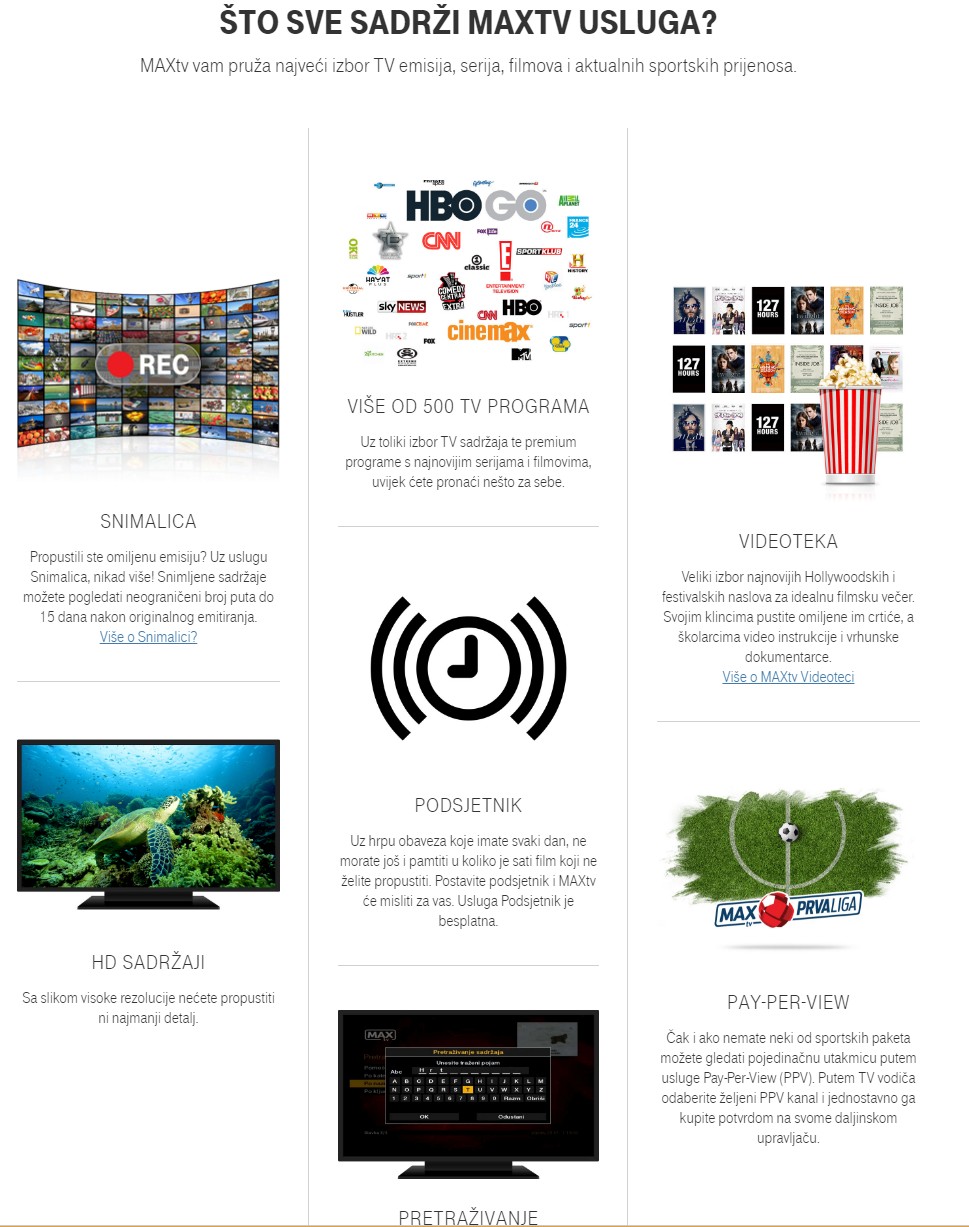 Brzi internet je potreban za svaki moderan TV, već i u nižim cjenovnim razredima, da bi ste koristili prednosti Smart TV platforme. MaxTV nudi vrhunsku kvalitetu slike u visokoj HD rezoluciji, najnovije serije, filmove i dječji sadržaj putem Pickbox i HBO paketa te vrhunski sportski sadržaj poput UEFA Lige prvaka i UEFA Europske lige, MAXtv Prve Lige i Formule 1.