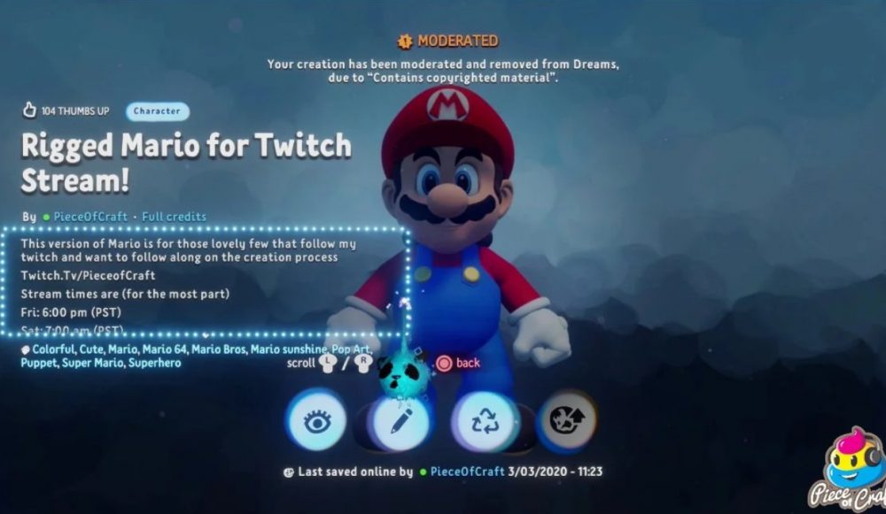 Naime, jedan od “Dreamera”, igrač pod nadimkom Piece_of_Craft, tvrdi kako je iz Dreamsa uklonjena njegova kreacija Super Maria, te da je dobio obavijest od pravnog odjela Sony Interactive Entertainmenta u kojoj stoji da je do uklanjanja njegovog sadržaja došlo nakon zahtjeva Nintenda.