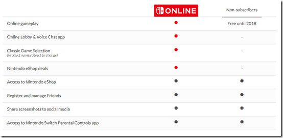 Besplatna, eksperimentalna verzija aplikacije bit će dostupna od ovog ljeta. Multiplayer na Switch-u do izlaska pune verzije Online-a će biti besplatan. Iako je dosada plan bio dopustiti pretplatnicima Online servisa besplatan pristup jednoj igri svaki mjesec, ta odluka je u međuvremenu promijenjena u dopuštanje pristupa klasičnim Nintendo igrama, poput Dr. Mario, Balloon Fight, i Super Mario Bros. 3. Igre će biti dostupne svim Switch korisnicima, dokle god su pretplaćeni na Online servis.