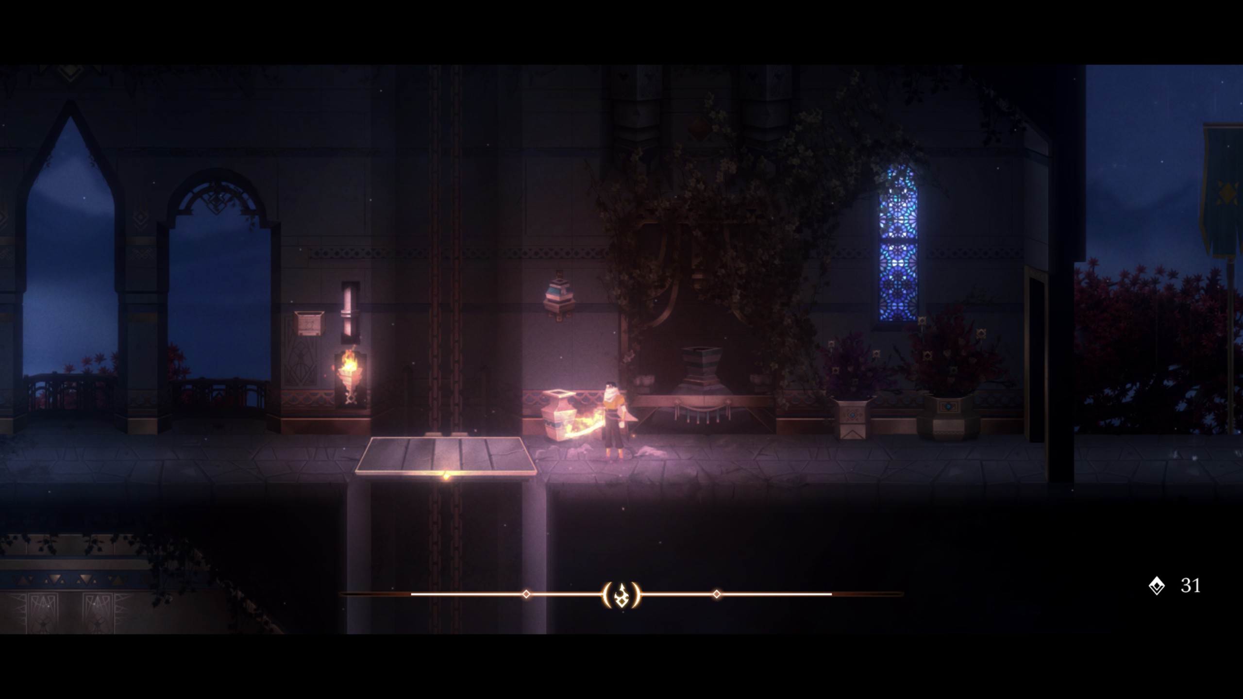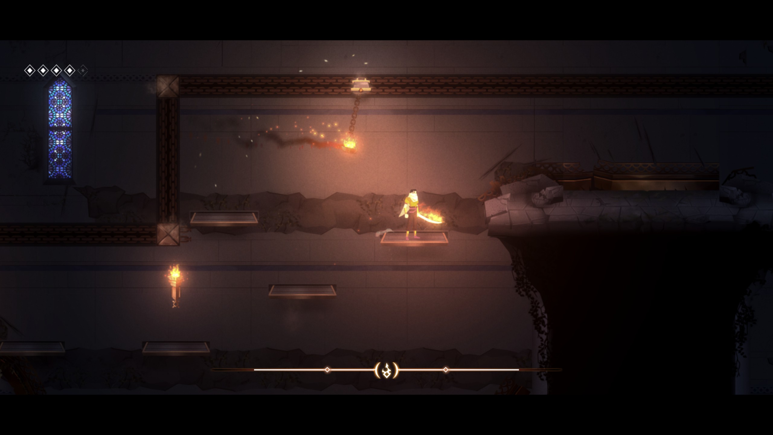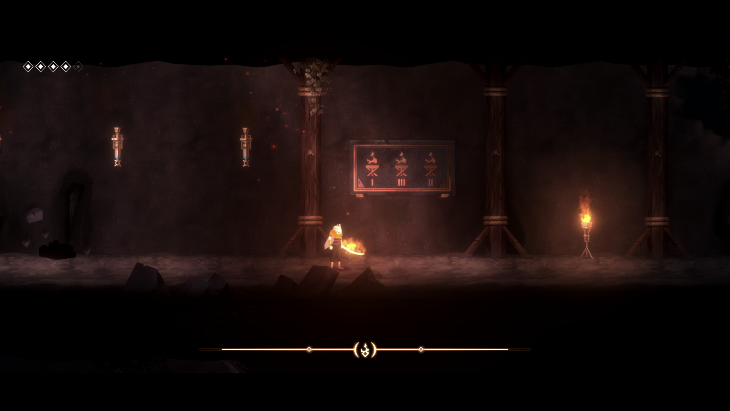 Tama se može pobijediti ili rastjerati samo vatrom, pa je sreća što Ardeshir ima mač prožet plamenom. Točnije, mač je magičan, a možete ga zapaliti tako što ćete dotaknuti baklju. Baklje se nalaze preko cijele jedne razine, neke će već biti zapaljene, dok ćete druge vi morati zapaliti. Paljenje baklji omogućuje vam da otključate neku skrivenu sobu, pokrenete mehanizme koje vas nose gore ili dolje, jače udarate neprijatelje ili onemogućite tami da vas prožme. Mač nije njegovo jedino oružje, budući da ćemo tijekom igranja otključati i nož kojeg ćemo moći bacati na neprijatelje, s kojim ćemo također moći zapaliti baklje ili uništiti vaze koje nam daju određene novčiće za nadogradnju naših sposobnosti. Kad skupimo određenu količinu novčića, moći ćemo ojačati našeg junaka, pa ćemo tako imati veću energiju, mogućnost da vatra traje duže ili da otključamo neke posebne vještine.