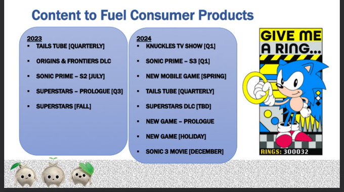 Naime, na Redditu se pojavila nova prezentacija koja, kako se tvrdi, potječe iz Sege i njihovog internog sastanka, a opisuje što će izdavač raditi sa Sonicom tijekom sljedeće godine. Već tijekom sljedećih nekoliko mjeseci, Sega će navodno izdati Knuckles TV seriju za Paramount+, treću sezonu Sonic Primea na Netflixu i DLC za Sonic Superstars. Osim toga, navodi se da se očekuje izlazak “nove igre” povezane sa Sonicom tijekom blagdanske sezone 2024. godine Ova igra bi se trebala poklapati s izlaskom filma Sonic the Hedgehog 3, koji će stići u kina u prosincu sljedeće godine.