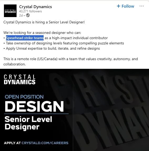 Uobičajena praksa u gaming industriji nalaže da se “strike timovi” angažiraju neposredno pred samo lansiranje igre ili čak prije službenog predstavljanja javnosti, kako bi se osigurala besprijekorna kvaliteta finalnog proizvoda. S obzirom na to da se uskoro bliži ovogodišnji Summer Game Fest, nije isključeno da bi Crystal Dynamics upravo na ovom prestižnom događaju mogao konačno svijetu predstaviti 12. po redu igru u Tomb Raider sagi.