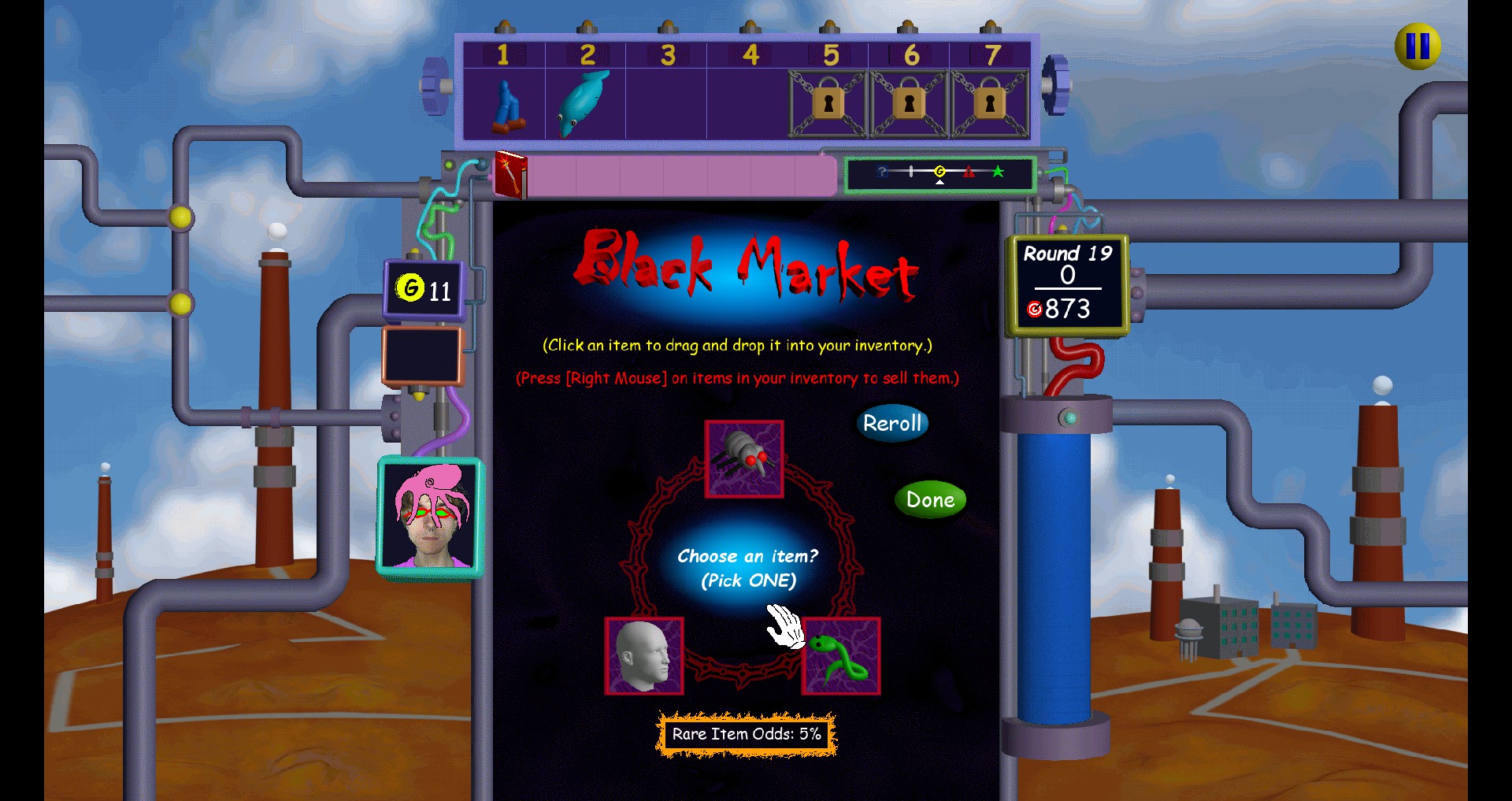 Sasvim jednostavan koncept, zapravo, ali kao što i Balatro svoj koncept posuđuje od pokeraških karata, odnosno mogućnosti kombinacija istih, tako i Nubby svoj koncept začinjava raznim nadogradnjama i perkovima koje će vam pomagati (ili odmagati) na putu do posljednjeg bossa nakon kojeg otključavate endless mode. Nakon određenog broja riješenih runda, igra će vas odvesti na jednu od tri mogućih lokacija: dućan/kafić, claw machine ili crno tržište. Dućan vam omogućuje kupnju dodatnih nadogradnji, a u kafiću možete kupiti hranu za obnavljanje života, dodavanje novčića itd. Claw machine je klasična igra kandže kakvu možete pronaći u trgovačkim centrima, samo što ovdje svaki put dobijete nešto, bila to dodatna nadogradnja, koji dodatni novčić ili, ono najbolje, tajnoviti ključ! Ključem možete otvoriti vrata crnog tržišta što će vam otvoriti mogućnost uzimanja ukletih nadogradnji koje su znatno jače od uobičajenih, ali dolaze uz par kvaka stoga pažljivo čitajte što kupujete!