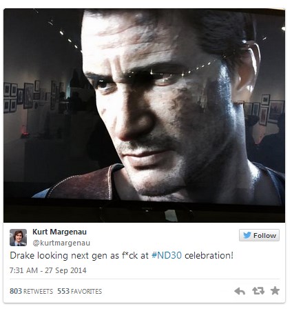 Glavni dizajner igre Kurt Margenau objavio je dotičnu sliku i putem Twittera, uz prigodan komentar o Drakeovom next-gen izgledu.