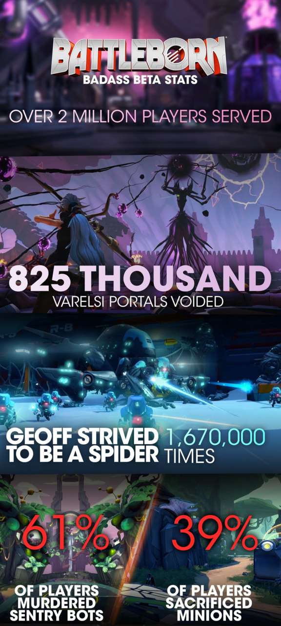 Naime, 2K je putem bloga objavio zaista sjajne statističke podatke za Battleborn otvorenu betu – u periodu od 13. do 18. travnja kompletirano je 1,1 milijuna kompetitivnih multiplayer mečeva i odigrano 1,4 milijuna epizoda Story Moda, a uz sve to igrači su uspjeli skupiti 27 milijardi Shardova. Zbog tog uspjeha, kada igra službeno stigne u prodaju, igrači će biti nagrađeni s tri “zlatna” skina za likove (ISIC, Benedict i Shadyne & Aurox).