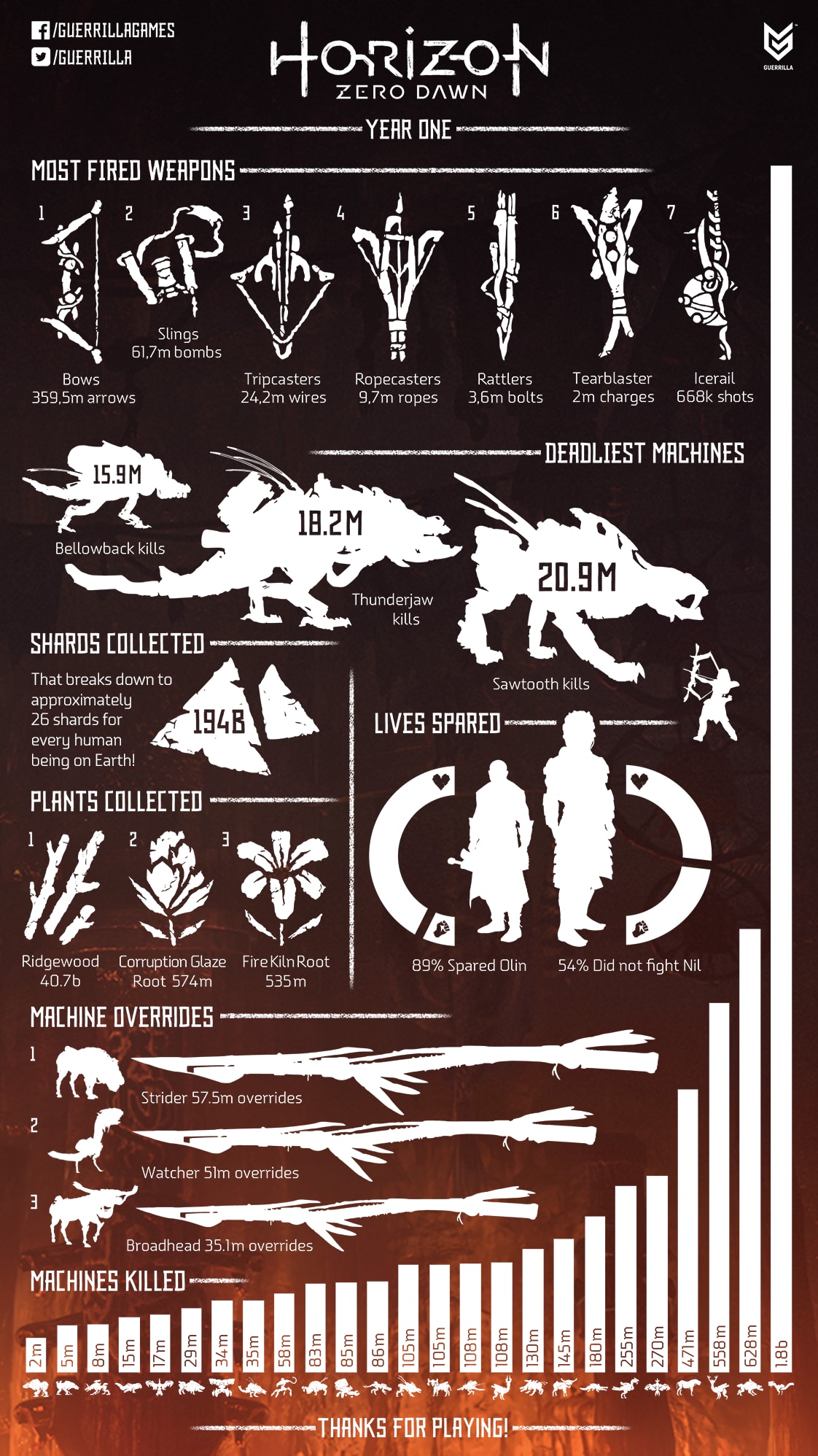 Sjajna PS4 ekskluziva Horizon Zero Dawn nedavno je proslavila svoj prvi rođendan, uspjevši se za godinu dana prodati u preko 7,6 milijuna primjeraka, a priliku da je još malo nahvale Sony i ekipa iz Guerrilla Gamesa iskoristili su putem PlayStation Bloga, na kojem su zajedno s novim odgovarajućim trailerom objavili i detaljnu infografiku vezanu za igru. O kakvim brojkama se radi, pogledajte ispod!