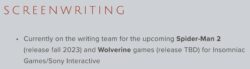 UPDATE: Jedna od scenaristica (Jamie Mayer @heavymeta3000) iz Insomniaca se “izlanula” na svojoj web stranici (portfoliu) da Spider-Man 2 stiže u jesen 2023.godine. Ubrzo se ispravila i sada na webu stoji samo 2023.g. Kao i uvijek, internet pamti sve, pa i taj sada obrisani detalj.