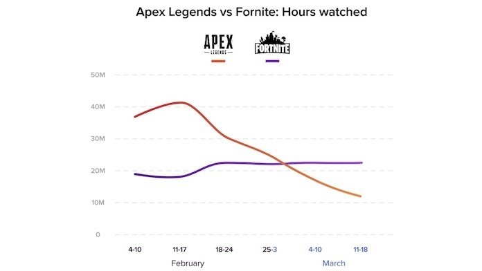 Najznačajniji indikator pada popularnosti jest broj streamera na Twichu koji prikazuju igranje ove igre. Prema zadnjem izvještaju Stream Elements agencije, gledanost Apex Legends streamova na Twitchu je u stalnom i jako padu. Za to vrijeme Fortnite streamovi su i dalje na stalnom broju, i duplo je veća od Twitch gledanosti Apex Legendsa.