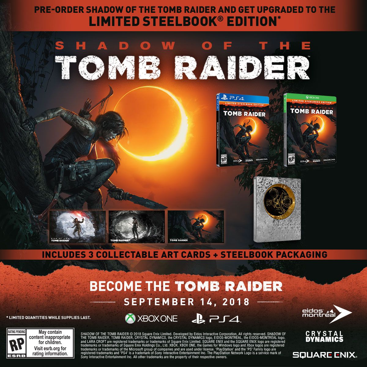 Osim standardne igre, Shadow of the Tomb Raider Digital Deluxe Edition svojim kupcima nudi i rani dvodnevni pristup istoj, kao i Additional Skills Booster Pack, digitalni Soundtrack te dodatne Weapon i Outfit Packove. Croft Edition će se sastojati od svega navedenog, kao i dodatnih Weapon i Outfit Packova i Season Passa za igru, doke će najskuplji Ultimate Edition još imati i kolekcionarsku statuu Lare Croft, ice axe otvarač za flaše i Tomb Raider tematsku svjetiljku.