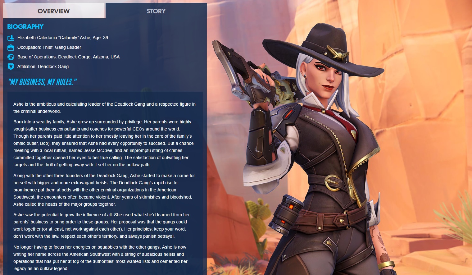 Tijekom BlizzCon 2018 keynotea predstavljena je kaubojka Ashe, liderica Deadlock Ganga i okrutna revolverašica koja se ne boji uprljati ruke (hm, možda joj je mjesto uz Van Der Lindeovu bandu iz RDR2..).