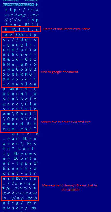 Ovaj malware se širi putem Steam chata. Jednom kada se korisnici spoje na svoj nalog, zlonamjerni napadač šalje korisnicima maliciozne linkove. Ponekad koristi Steam marketplace kako bi korisnicima ponudio raznorazne igre po iznimno niskim cijenama te ih na taj način namamio i uvjetovao ih da instaliraju određeni screensaver ili igru. Jedan od takvih instalacionih fajlova mogao bi glasiti ovako: