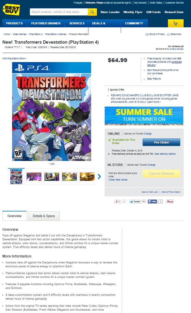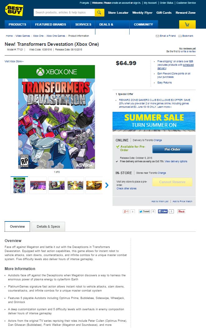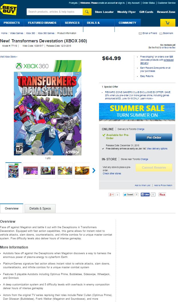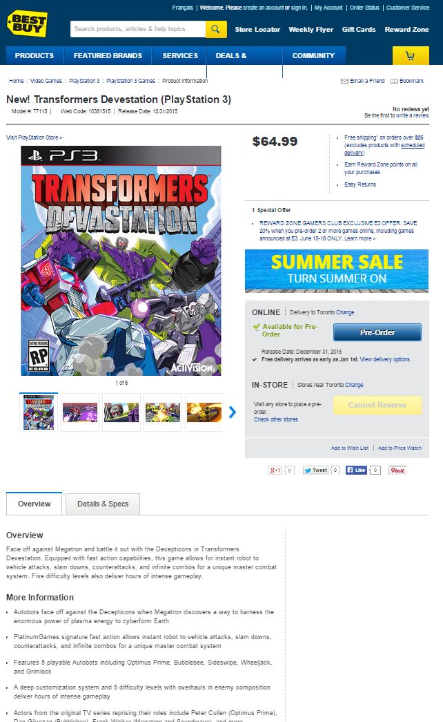 Naime, na stranicama kanadskog Best Buya osvanula je igra Transformers: Devastation (u galeriji printscreenovi kao dokaz, pošto je igra ubrzo potom uklonjena iz ponude), akcija zasnovana na Transformersima G1 (napokon!), namijenjena PS3, PS4, Xbox 360 i Xbox One platformama (box artove također možete pronaći u galeriji ispod), a kao developer naveden je upravo Platinum Games, koji je nedavno za Activision razvio i cel-shaded akciju Legend of Korra.