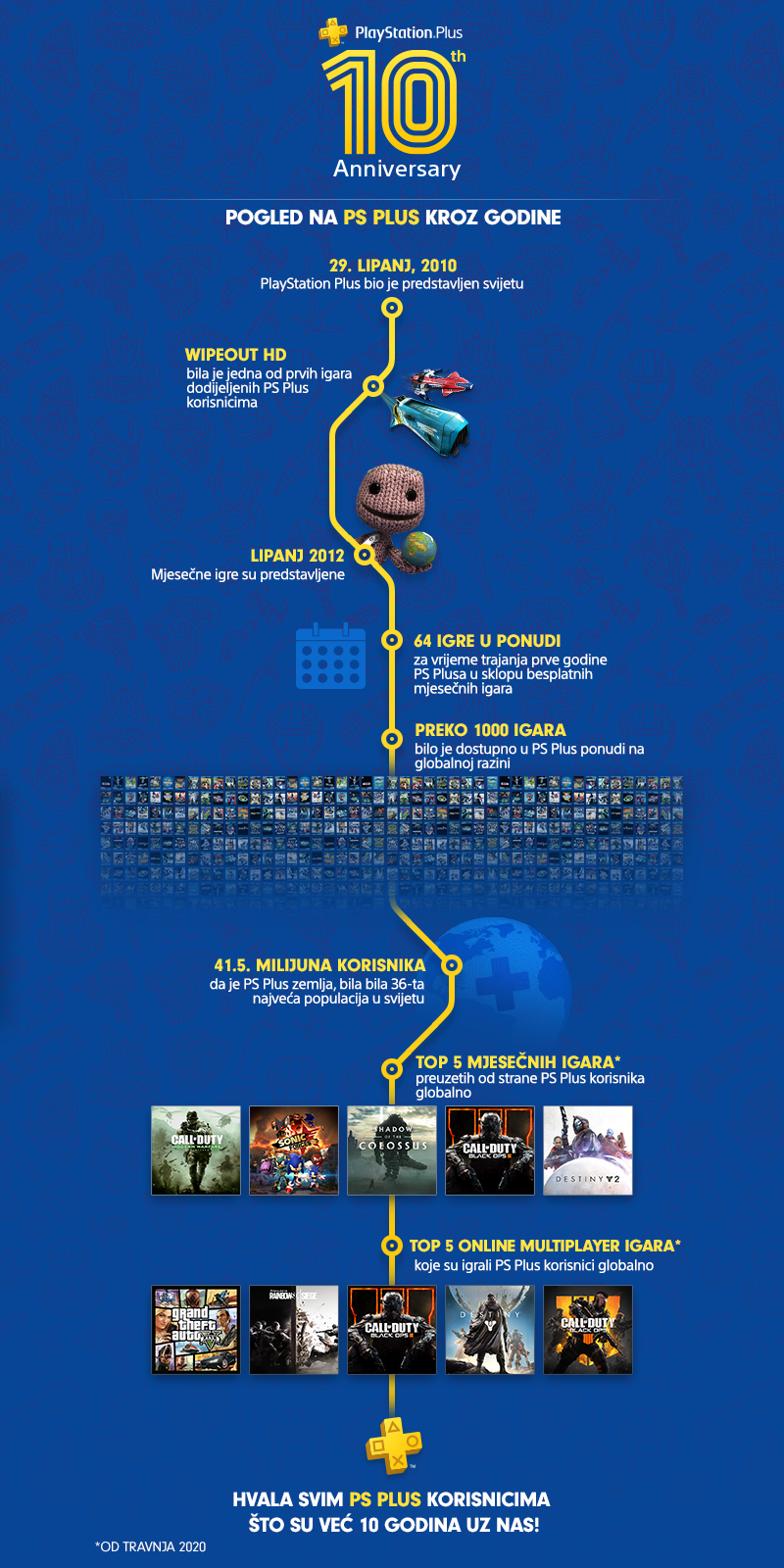 Kako bi proslavili 10 godina PS Plusa, uz impresivnu infografiku koja se nalazi iznad, iz Sonyja su nas odlučili počastiti i novom prigodnom PS4 temom. Tema će biti dostupna putem PlayStation Storea ograničeno vrijeme pa obratite pažnju. Za one od vas koji nisu isprobali pogodnosti PS Plus online igranja za više igrača, vrijedi naglasiti i to da će u periodu od 4. srpnja u 12:01 do 5. srpnja u 23:59 po lokalnom vremenu biti dostupan besplatni vikend.