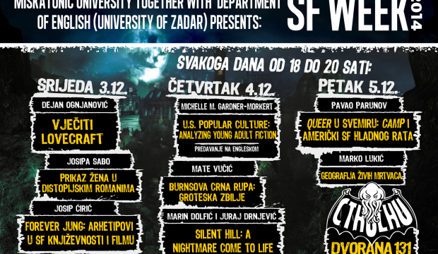 I ove godine se na Sveučilištu u Zadru održava SF Week. Ukupno sedmi, SF Week organiziraju profesori i studentice Odjela za anglistiku Sveučilišta u Zadru , a sadrži veliki broj predavanje o raznim aspektima Sci-Fi/Horor/fantasy žanrova. Cilj ovog projekta je popularizirati znanstvenu fikciju unutar akademskog kruga, odnosno uporabu žanra kao apstraktnog edukativnog instrumenta. Usto, želi se popularizirati žanr znanstvene fikcije i na taj način razbiti ustaljene akademske kanone koji su zavladali domaćom akademskom scenom.
