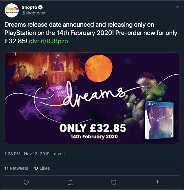 PlayStation 4 ekksluziva Dreams još nema službeni datum izlaska, ali pojavila se prva pogreška online trgovina koja je dovoljna da počnemo špekulirati o slučajno objavljenom datumu izlaska. Ovoga puta se ne radi o Amazonu, već o ShopTo stranici koja je, uz objavu tvita o igri, navela da igra dolazi u njihovu online trgovinu 14. veljače 2020. godine. Nedugo zatim, ShopTo su izbrisali objavu, pa imamo samo sliku njihovoga tvita: