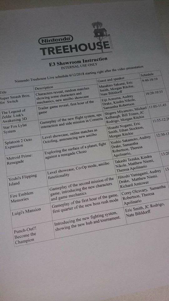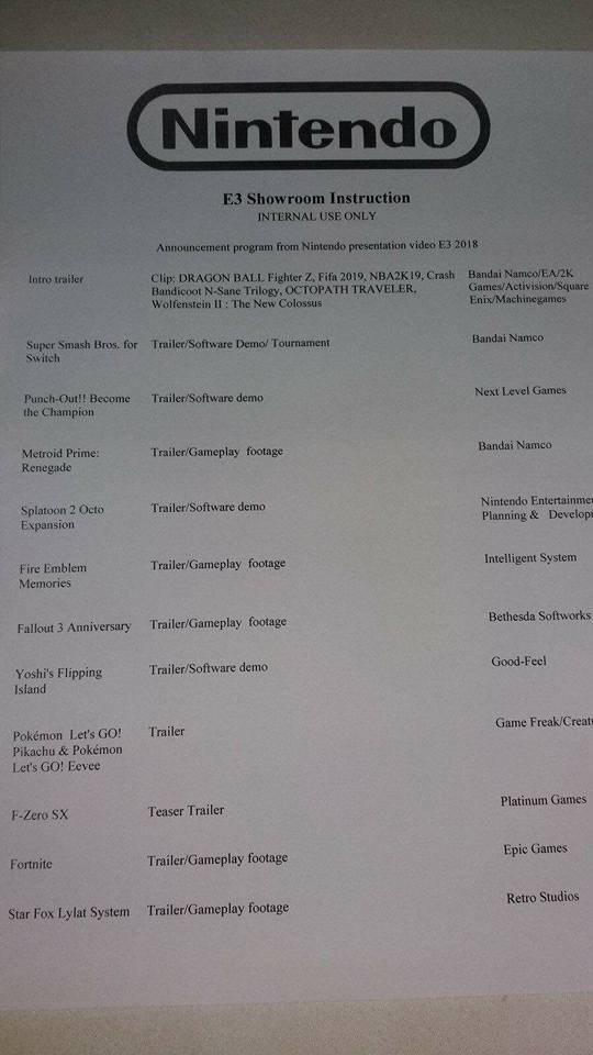 Kao i što to biva sa svakim E3 sajmom, i ove godine svjedočimo velikom broju glasina, ali i leakova koji se često čine dosta uvjerljivima. Jedan od njih je fotografija popisa koji je namijenjen novinarima koji dolaze na E3 sajam, a koji donosi popis Nintendovih igara koje će biti predstavljene tijekom ovogodišnjeg E3 sajma. Na popisu (čije fotografije možete vidjeti ispod) nalaze se igre kao što su Fire Emblem Memories i Luigi’s Mansion za koje će biti prikazani poduži gameplay isječci. Na rasporedu je otkrivanje novih likova za Switch verziju Super Smah Bros igre, kao i trailer za novu Zelda igru, Link’s Awakening 3D. Zanimljivo je za primijetiti da se na popisu igara nalazi i treći nastavak Fallouta, iako se dosad pričalo o dolasku četvrtog nastavka za Nintendo Switch. Kompletan popis možete vidjeti i sami ispod, te ipak barem glumiti suzdržanost jer točnost ovih informacija nije potvrđena.