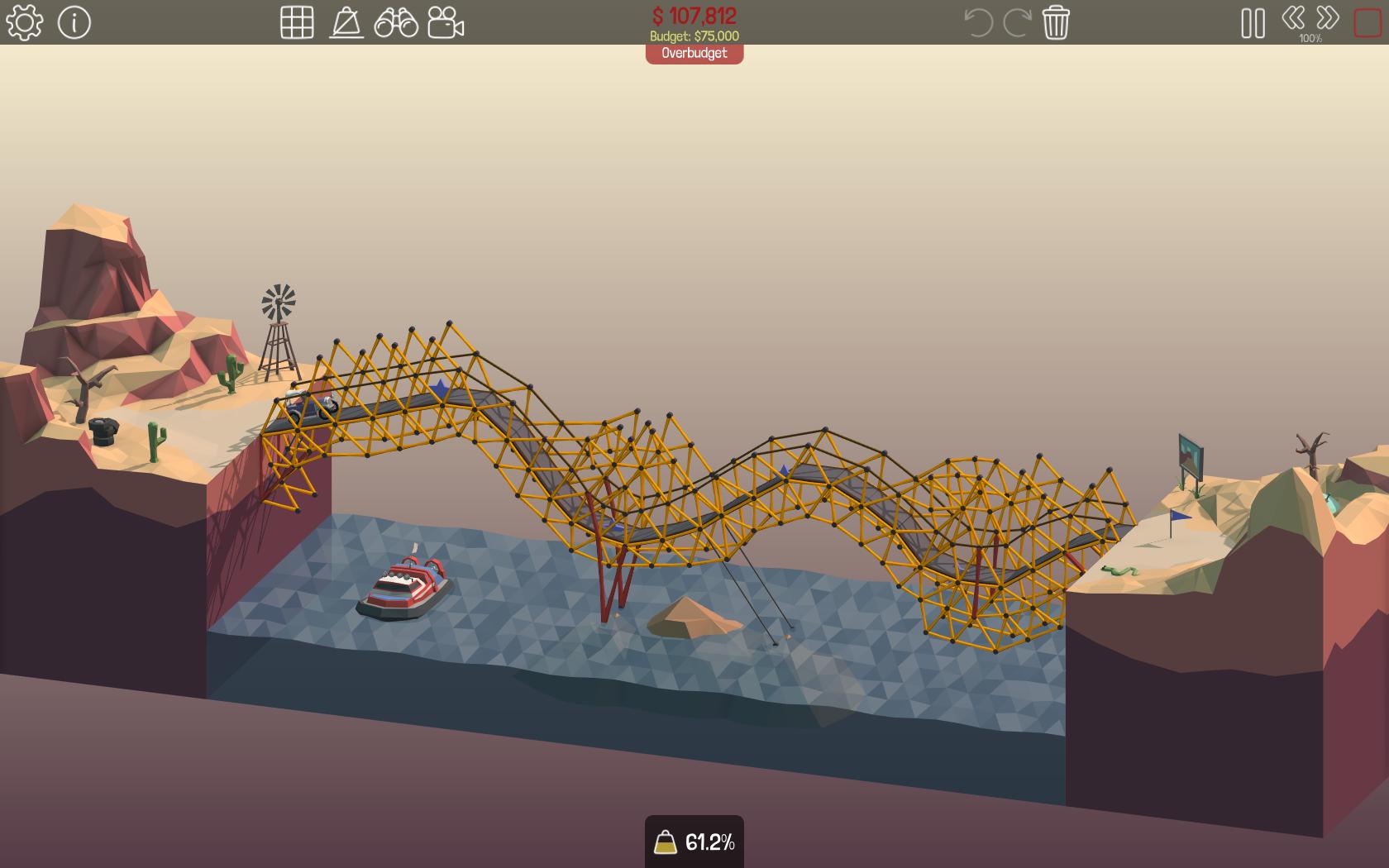 Što je šteta… Poly Bridge je uistinu mogao biti jedan od najboljih fizikalnih puzzlera ove godine. Da, puzzler, jer Poly Bridge žanr više vuče prema izvornim korijenima nego prema simulacijskim suvremenim elementima. Ima Poly Bridge čak i u kampanji sjajnih momenata, pa čak i genijalnih, posebno u prvih 20-30 sati igranja. Poly Bridge je najbolji kada dozvoljava dobar miks zaigranosti, destrukcije i suicidnih tendencija sa daškom ekonomske taktičnosti. Naime, svaki nivo je, barem dok ga jednom ne pređete, budžetski ograničen, tako da morate paziti koliko elemenata pri gradnji koristite. Također, još jedna bitna napomena je da most ne mora ostati stabilan ukoliko vozilo dođe do svog konačnog cilja. Dakle ako izgradite suludu konstrukciju koja je jedva održiva i suicidnim skokom kroz 5-6 prevrtanja vaš hipi-kombi dogurate do cilja, a most se nakon toga sastavi sa morem ili helikopterom, ne morate moriti brige. Kad smo već kod helikoptera vrijedi napomenuti da ćete često morati voditi računa o saobraćaju koji prolazi pored mosta, a to su najčešće brodovi i zrakoplovi, jer je obično svaki dodir mosta sa njima fatalan.