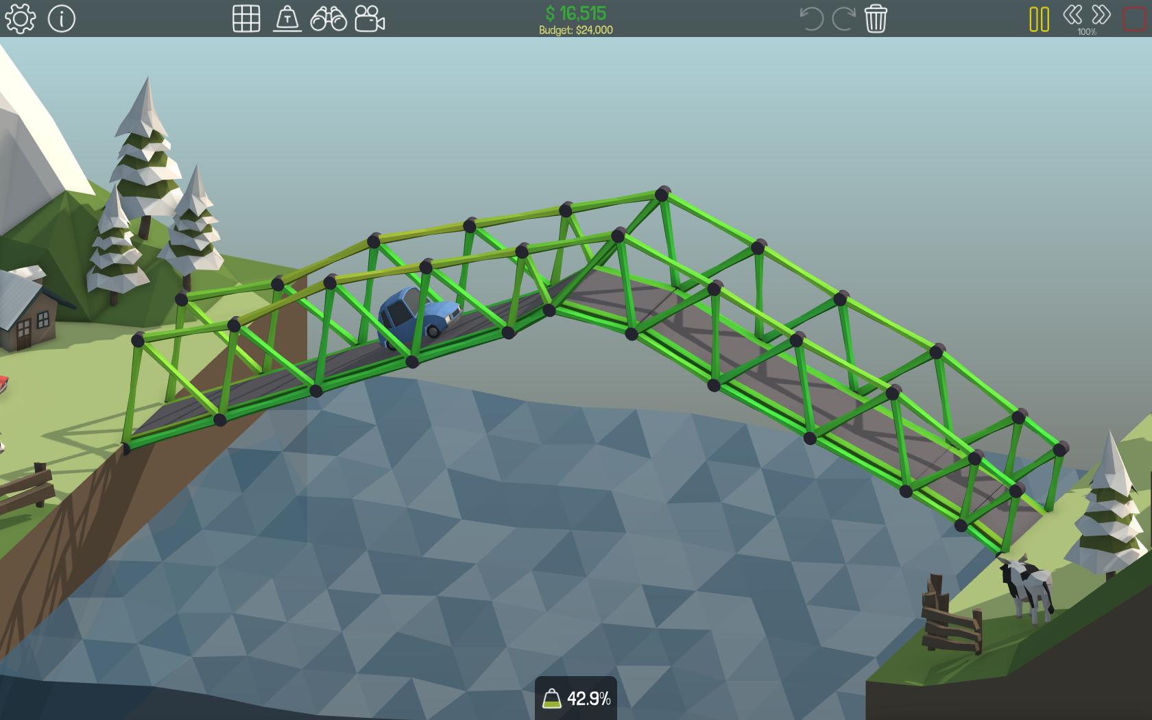 Ako bi Poly Bridgeu sudili samo po njegovoj kampanji, koje je postavljena kao centralno mjesto igre, stvari se ne bi mogle završiti na dobrom. Konceptno sve bi trebalo štimati: imamo dopadljivu poligonalnu grafičku prezentaciju, opuštenu atmosferu potpomognutu simpatičnim zvukom klasične gitare, te naizgled dovoljno primjetne osnove elemente izgradnje mosta. Stvar dodatno začinjava često otkačen izbor vozila čije kretanje i težinu vaši mostovi moraju izdržati kako bi dospjeli do checkpointa. Kao još jedna zanimljivost je i pseudorealistična fizika, koja daje naizgled dodatni otklon od sirove realnosti konkurenata. No, Poly Bridge ima jedan fundamentalni dizajnerski problem, a to je da postaje sve više naporan i nepodnošljiv kako kampanja odmiče.