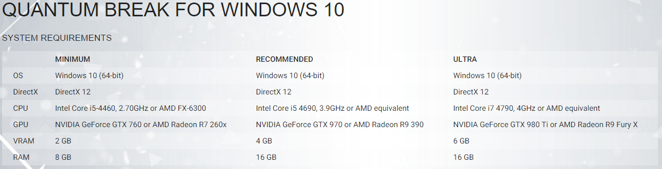 Također, uz najavu PC verzije Quantum Breaka, dobili smo novi trailera, ali i uvid u hardverske specifikacije, potrebne za igranje iste, a koje se baš i neće svidjeti prosječnom PC gameru. Donosimo vam pregled minimalne, preporučene i “ultra high” konfiguracije, a hoćete li na svojim PC kantama moći igrati Quantum Break, pogledajte na slici ispod.