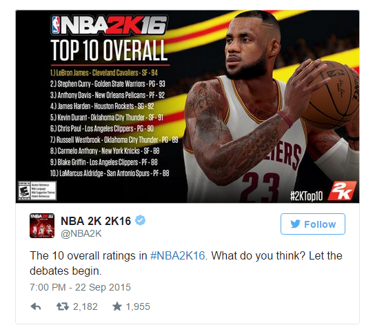 2K Sports je objavio popis 10 najbolje ocijenjenih igrača ovogodišnjeg izdanja najbolje košarkaške simulacije svih vremena, igre NBA 2K16.