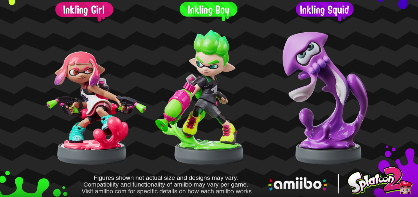Uz predstavljanje Salmon Run moda, Nintendo je predstavio i nove Splatoon 2 amiibo figurice – Inkling Girl, Inkling Boy i Inkling Squid. Nova tri lika bit će u potpunosti dostupna u igri te će stići s velikim brojem customizacijskih opcija.